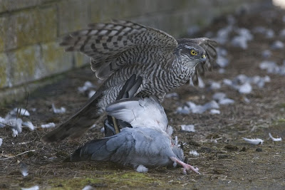 These pictures may not be to everyone's taste, but they do illustrate the effectiveness of a female Sparrowhawk with her prey. What follows are Maurice's own words describing his experience: Bit grizzly this, but what a great photo opp! I was driving back from the gym today and came a slightly long way back as was listening to the radio. Saw this scuffle by the side of the road and slowed down to look. Sparrowhawk wasn't bothered by the car at all so I dashed home to get the camera. I was back within a couple of mins and fortunately the bird was still there and the car was a perfect hide. Luckily there were no pedestrians around to frighten it off. Finally a gormless youth walked right up to it and frightened it off, but not before I had rattled off over 150 RAW files and practically run the batteries flat. The pigeon is basically being eaten alive and I think it was still more or less still alive when the Sparrowhawk was scared off. I thought she would come straight back as this was such a big meal but she didn't. I've got more photos than I can cope with at the moment so here's some highlights.