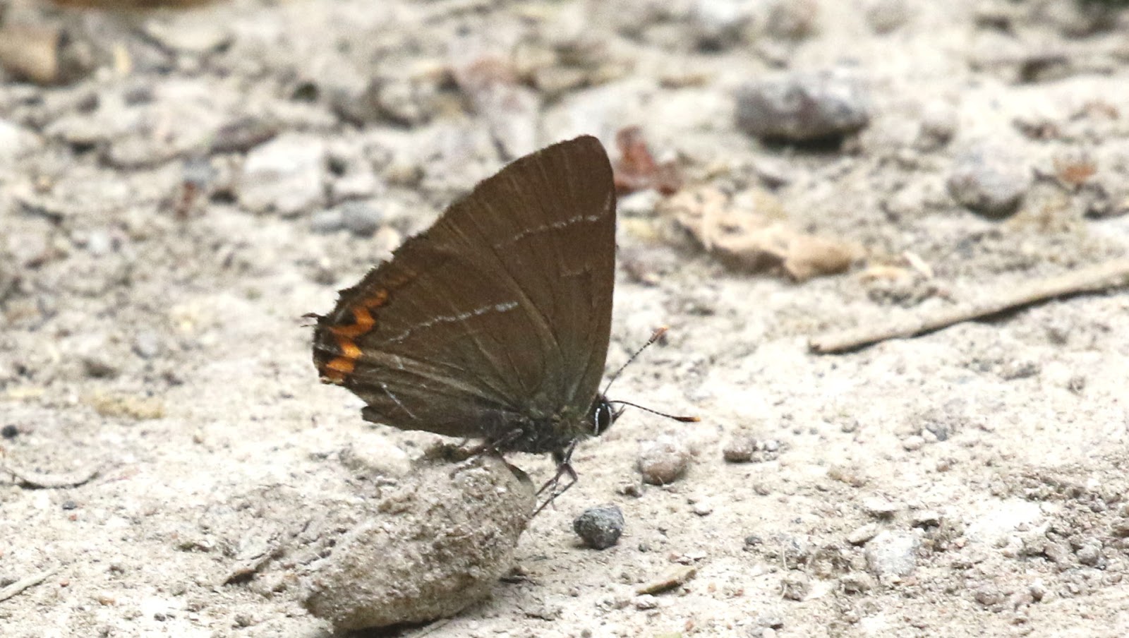 Nearby was another Hairstreak with striking orange colouration near its back end. this is a darker butterfly than the Purple Hairstreak.