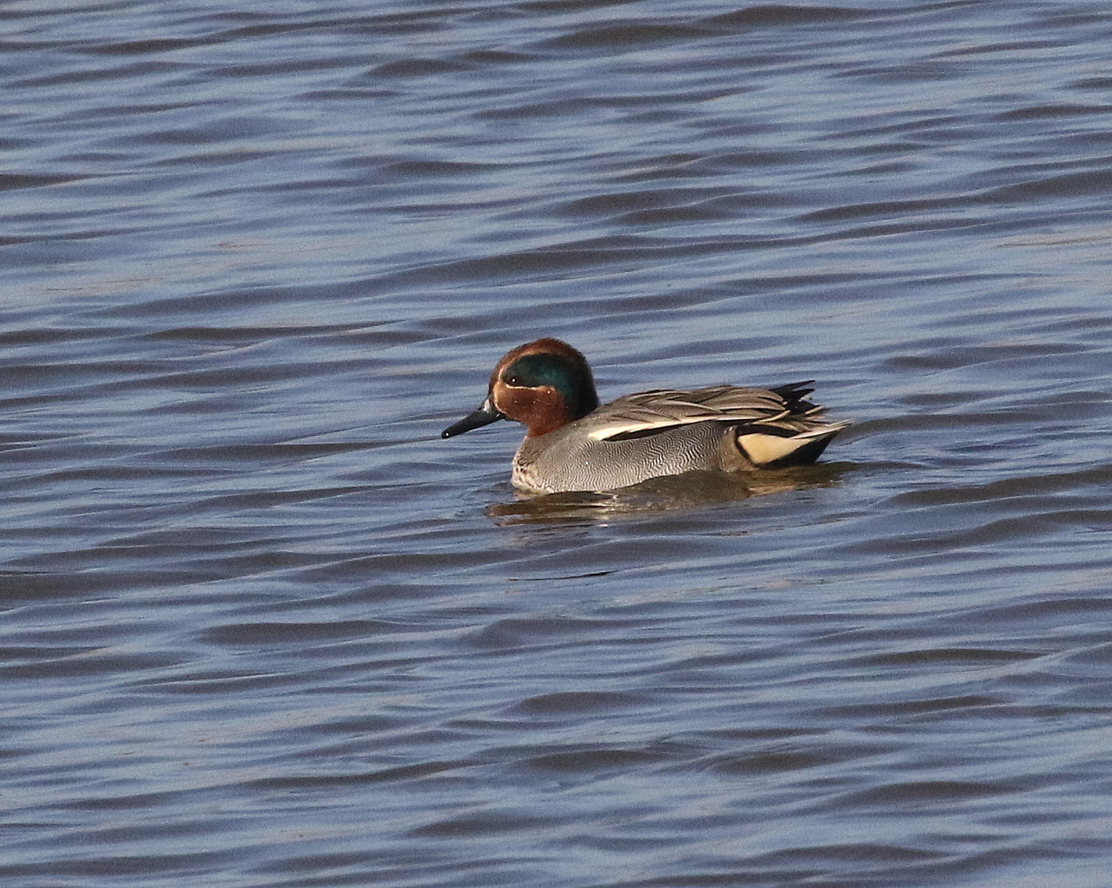 We shared cars to Lin Dyke, and were surprised to find a Pintail, but also some Pochard, Teal, and more Goldeneye.  We heard a Curlew, and saw a Buzzard take to the air.  When we returned to the car park, Sue spotted the Peregrine, which was probably the star bird of the morning.  By this time it was almost hot, and everyone was wearing too many layers.