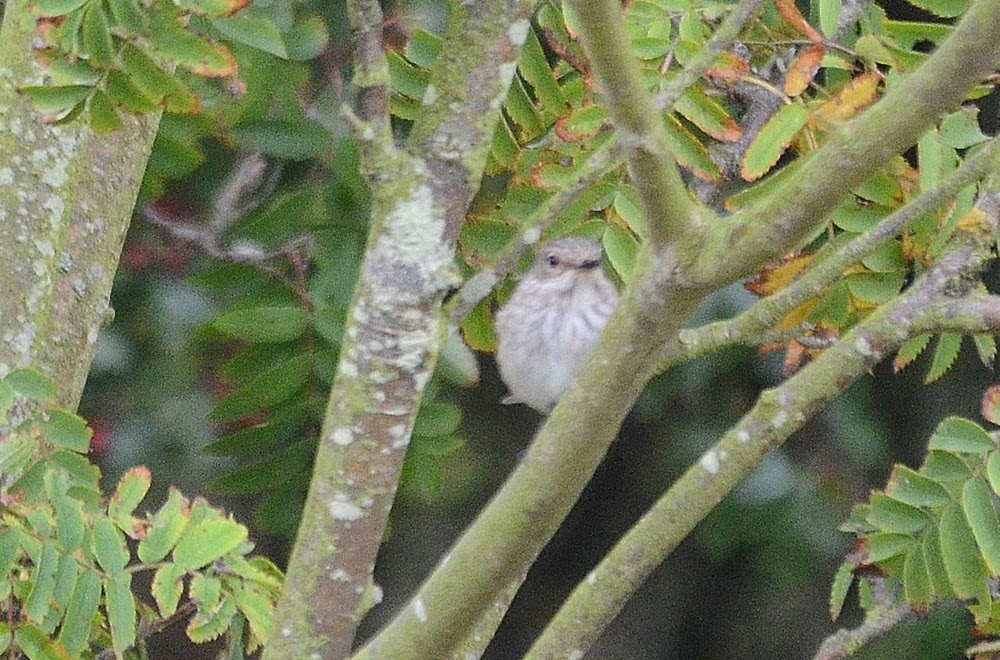 We crossed the road to the edge of the river, and all but one of us managed to dodge the numerous piles of dog mess. There were 2 very confiding Dunlin looking for food on the mudflats with Redshank further away, a single Curlew and a few Ringed Plovers. Then someone noticed a Spotted Flycatcher in the garden of the large house on the seashore. It posed well and went on several violent insect hunting sorties before returning to its favourite artificial perch. A few minutes later a young Restart was seen, and this was observed for several minutes as it too hunted for its insect prey. A Yellow-Browed Warbler may have been heard briefly on the return to the car park, but that was all.